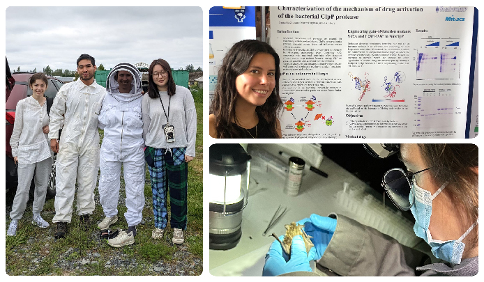 Por su parte, Sofía Daniela Flores Mejia, Angélica Guadalupe Arreola Martínez y Aranza Mateos Gómez estuvieron en la Universidad de Sasketchewan en donde trabajaron en diferentes actividades; por ejemplo, Sofía y Angélica fueron parte de un proyecto que analiza el impacto que tienen los pesticidas en los murciélagos, ya que estos se alimentan de insectos contaminados por dichas sustancias y también participaron en la búsqueda de especímenes en peligro de extinción infectados con el hongo white nose sindrome. Aranza estuvo en la facultad de medicina veterinaria, donde trabajó con abejas enfocándose en buscar un método que evite perder tantas colonias durante el invierno, y también buscó si los ácaros varroa tenían alguna relación con esto.
