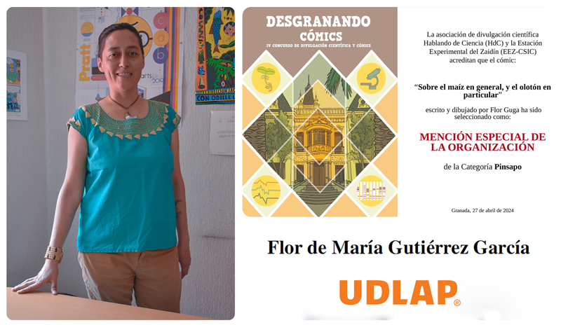 Flor Guga, profesora de tiempo completo del Departamento de Diseño de la Universidad de las Américas Puebla (UDLAP), obtuvo una mención especial en la cuarta edición del concurso: Desgranando Cómics, con su trabajo «Sobre el maíz en general, y el olotón en particular», una narrativa gráfica que expone la extracción de bienes biotecnológicos nacionales por parte de una empresa estadounidense.