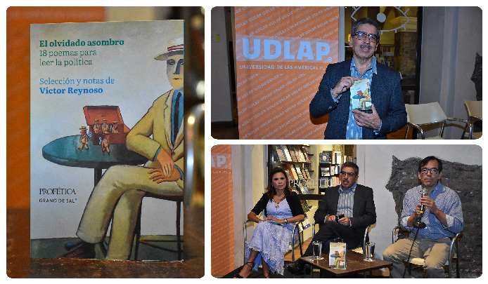 18 poemas plasmados en 96 páginas, es lo que nos ofrece el libro El olvidado asombro 18 poemas para leer la política, del Dr. Víctor Reynoso Angulo, académico de la Universidad de las Américas Puebla (UDLAP). «Este es un libro armado a lo largo de décadas en el que a través de la poesía se entiende a la política, porque se tienden puentes entre metáforas y fenómenos políticos, entre una imagen luminosa y algún acontecimiento social», comentó el también destacado politólogo, minutos antes de hacer la presentación oficial de esta obra de arte en Profética, Casa de la Lectura.