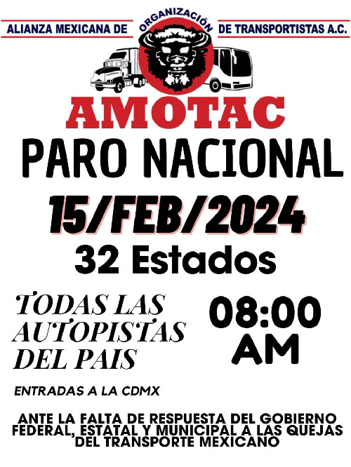 En entrevista para este medio, el delegado para Tlaxcala de la Alianza Mexicana de Organización de Transportistas A. C. (AMOTAC) Paulino Hernández Mendoza anunció que el próximo 15 de Febrero a partir de las 08:00 horas en tres puntos geográficos de la entidad se estarán manifestando pero también sumando de manera pública y pacífica al paro nacional; en contra de la inseguridad que prevalece en todo el país y una serie de pendientes, que las autoridades tienen para con el llamado hombre camión.