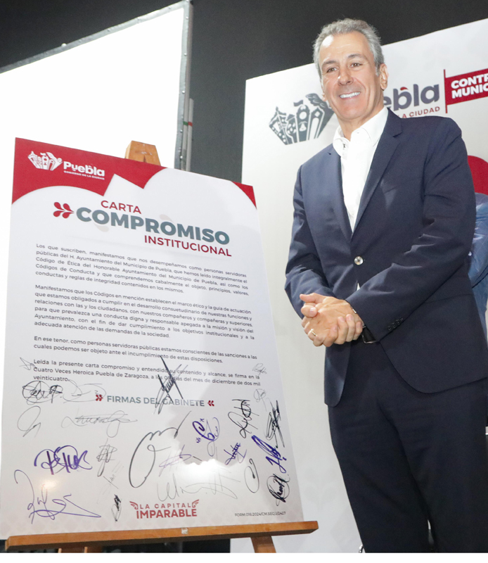 Las y los funcionarios del Gobierno de la Ciudad así como regidoras y regidores firmaron una carta compromiso institucional en la que afirman que cumplirán Código de Ética del Ayuntamiento de Puebla, así como los Códigos de Conducta y que comprenden cabalmente el objeto, principios, valores, conductas y reglas de integridad contenidos en los mismos.