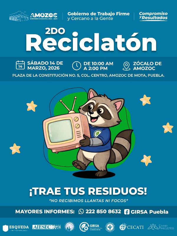 Amozoc de Mota, Puebla, a 10 de marzo de 2026.– El Gobierno Municipal de Amozoc 2024-2027 encabezado por el presidente municipal Severiano de la Rosa Romero, invita a la ciudadanía a participar en el 2º Reciclatón, una iniciativa que busca fomentar el manejo responsable de los residuos y promover el cuidado del medio ambiente en el municipio de Amozoc.