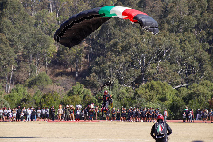 La jornada incluyó exhibiciones del equipo de alto rendimiento “Guerreros Águila”, integrado por 13 paracaidistas de caída libre —dos mujeres y 11 hombres—, así como módulos de servicios, actividades recreativas y espacios de convivencia familiar.