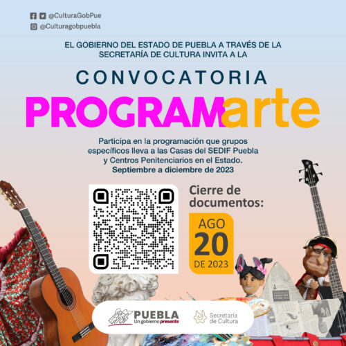 Como parte de las acciones que la administración estatal desarrolla para garantizar el derecho a la cultura en todos los sectores de la sociedad, el gobierno presente de Sergio Salomón, a través de la Secretaría de Cultura, invita a la comunidad artística a participar en la convocatoria “Progamarte”, la cual se encuentra disponible en el sitio web de la dependencia (sc.puebla.gob.mx).