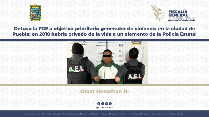 Como resultado de labores de investigación, trabajo de campo e inteligencia, la Fiscalía General del Estado logró la detención de Omar Honathan N., alias «El Negro», objetivo prioritario para la institución por ser presunto generador de violencia en la ciudad de Puebla a quien se le atribuye su probable participación en el homicidio de un elemento de la Policía Estatal ocurrido en 2018.