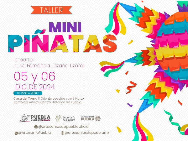 Como parte de las actividades decembrinas que desarrollará el gobierno presente de Sergio Salomón, la Secretaría de Cultura impartirá un taller de mini piñatas en la Casa del Torno, ubicada en la 6 Oriente esquina con 8 Norte, en el Barrio del Artista del Centro Histórico.