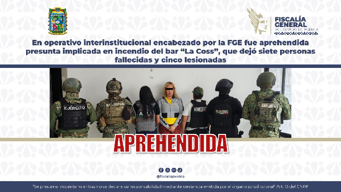 Lo anterior, como resultado de actos de investigación realizados a través de los cuales se obtuvieron diversos datos de prueba para identificar a Isabel N., como presunta partícipe en los hechos ocurridos el pasado 18 de noviembre, en el bar «La Coss», ubicado en la colonia Popular Coatepec, de la ciudad de Puebla, donde fue provocado un incendio que derivó en la muerte de siete personas y cinco más resultaron lesionadas.