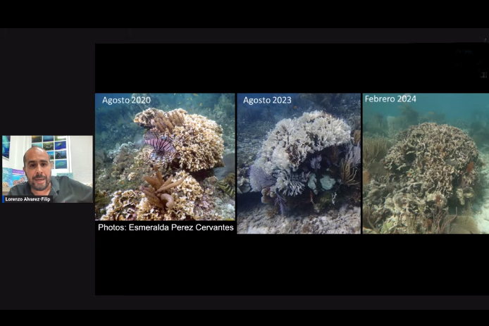 Durante su ponencia, Lorenzo Álvarez destacó que en la última década el incremento de temperatura propició olas de calor nunca antes registradas en al menos 57 países, donde se observó un estrés en los corales, lo que ocasionó el llamado fenómeno de blanqueamiento que provoca su muerte.