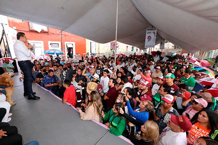 El candidato de la colación «Sigamos Haciendo Historia» Alejandro Armenta acompañado de su hija Ceci Armenta Arellano, adelantó que habrá una lluvia de recursos para la ciudad y los barrios, «estamos haciendo un homenaje, y estamos aquí para reconocer, los líderazgos de los barrios que hoy son representados por cuadrillas de Huehues del Alto, arte, deporte y cultura irán de la mano».