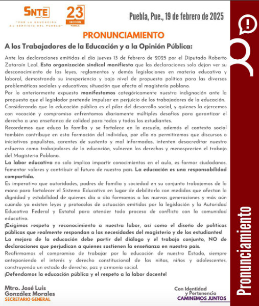 Esta organización sindical manifiesta que las declaraciones solo dejan ver su desconocimiento de las leyes, reglamentos y demás legislaciones en materia educativa y laboral, demostrando su inexperiencia y bajo nivel de propuesta política para las diversas problemáticas sociales y educativas; situación que afecta al magisterio poblano.