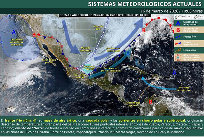 Puebla, Pue., 16 de marzo de 2026.- El Gobierno de la Ciudad que encabeza el presidente municipal, Pepe Chedraui, informa que en las próximas horas se prevé un descenso de temperatura y lluvias derivadas del avance del Frente Frío No. 41. Por ello, de manera preventiva, mantiene vigilancia permanente ante este sistema y sus posibles efectos meteorológicos que pudieran presentarse en la capital.
