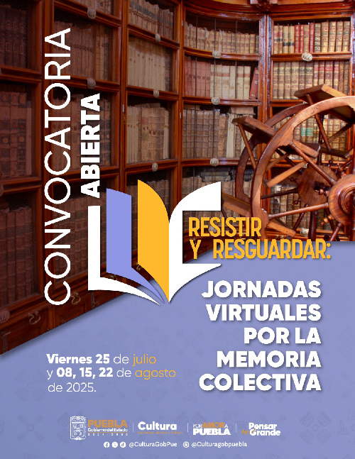 El Gobierno del Estado de Puebla, encabezado por Alejandro Armenta, a través de la Secretaría de Arte y Cultura, abrió una convocatoria para unirse al proyecto “Resistir y resguardar: Jornadas virtuales por la memoria colectiva”. Se trata de una serie de cuatro ponencias que buscan generar una red colaborativa de personas interesadas en dicha temática, mediante su participación en un espacio seguro para el encuentro, la reflexión y la formación de la misma.