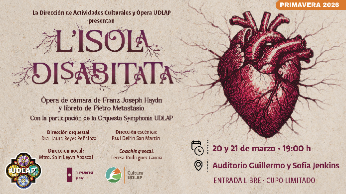 Con una propuesta escénica que combina el talento estudiantil, experiencia profesional y una cuidada visión artística, la Universidad de las Américas Puebla (UDLAP) presentará L’isola disabitata (La isla deshabitada), una ópera que demuestra que este género sigue vivo, vigente y al alcance de todos.