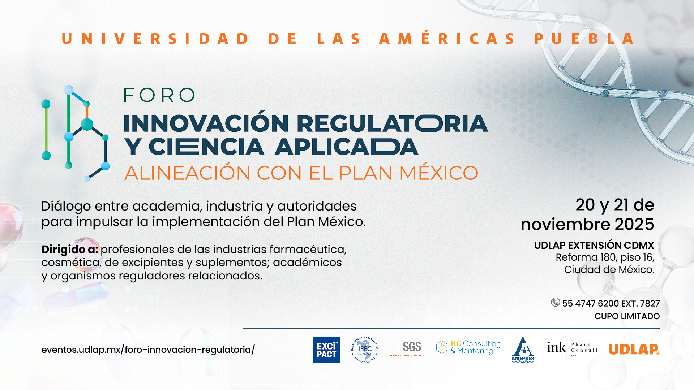 Los días 20 y 21 de noviembre, la Universidad de las Américas Puebla (UDLAP), a través de su Escuela de Ciencias, llevará a cabo en su Oficina Extensión CDMX, el Foro «Innovación Regulatoria y Ciencia Aplicada: Alineación con el Plan México», un espacio que reunirá a la industria, academia y gobierno, en un diálogo estratégico diseñado para fortalecer el ecosistema regulatorio y científico del país.