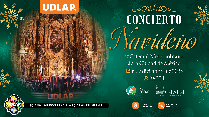 La Universidad de las Américas Puebla y la Catedral Metropolitana de la Ciudad de México, presentaron el Concierto Navideño 2025, una gala que reunirá a más de cien talentosos artistas de distintas licenciaturas y posgrados de la UDLAP, la mejor universidad privada de México, e incluirá, por primera vez, a jóvenes de nivel preparatoria provenientes de seis instituciones educativas invitadas.