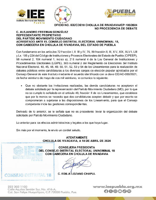De acuerdo con el número de oficio IEE/CDE18 emitido por el Instituto Estatal Electoral se establece: «Que no obstante las invitaciones realizadas, las demás candidaturas no aceptaron el debate solicitado por la representación del Partido Movimiento Ciudadano (MC), por lo que no se cumple lo señalado en el artículo 49, fracción ll de los Lineamientos, que establece que por lo menos se necesita que dos candidaturas acepten debatir y que por escrito se comprometan a sujetarse a las disposiciones de los lineamientos, para que el Consejo competente inicie las gestiones correspondientes».