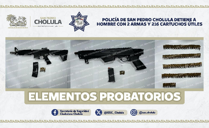Como resultado de una efectiva y pronta intervención, elementos de la Secretaría de Seguridad Ciudadana de San Pedro Cholula (SSC Cholula) detuvieron a Carlos Jair “N” de 40 años edad, por el presunto delito de posesión y portación de arma de fuego, en el Fraccionamiento Los Ángeles, ubicado en el Barrio de Jesús Tlatempa.