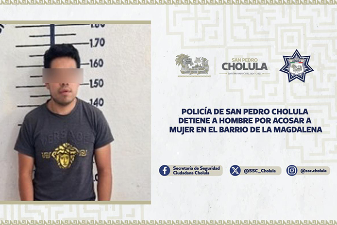 30 de marzo, 2026. San Pedro Cholula, Pue. – Con el objetivo de proteger el derecho de las mujeres y niñas a una vida libre de violencia, elementos de la Secretaría de Seguridad Ciudadana de San Pedro Cholula (SSC Cholula) detuvieron a Jesús Pablo “N”, de 26 años de edad, por su probable responsabilidad en el delito de abuso sexual en contra de una mujer, en el Barrio de La Magdalena.