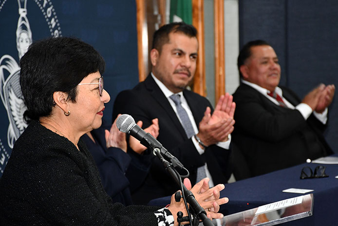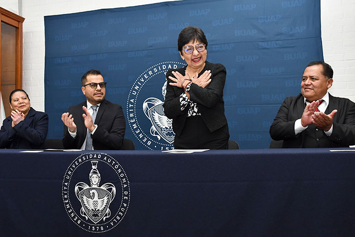 Rectora Lilia Cedillo Ramírez asiste al Primer Informe de Labores de Ernesto Sandoval Munive, director de la Preparatoria Gral. Lázaro Cárdenas del Río, de la BUAP.