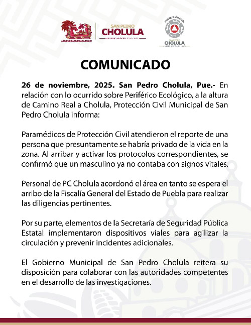 26 de noviembre, 2025. San Pedro Cholula, Pue. – En relación con lo ocurrido sobre Periférico Ecológico, a la altura de Camino Real a Cholula, Protección Civil Municipal de San Pedro Cholula informa: