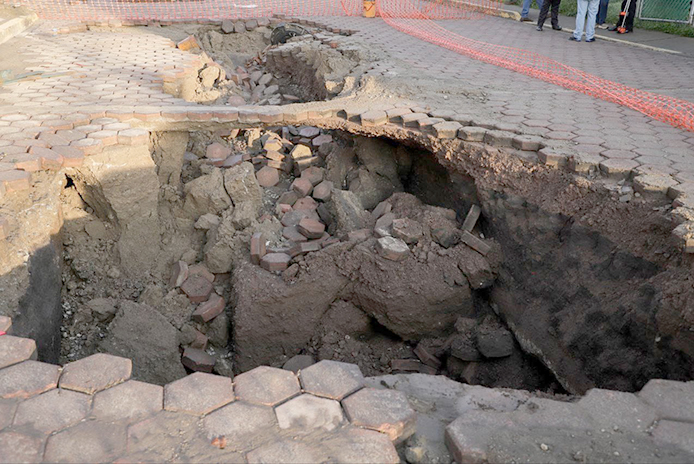 El nuevo socavón tiene unas dimensiones de unos 6 metros de ancho con aproximadamente 2 metros y medio de profundidad, y en la evaluación realizada esta mañana se indicó que se dio debido a la mala condición del colector pluvial que cursa por esta vialidad.