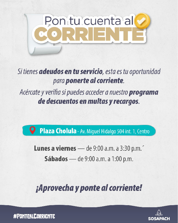 El Sistema Operador de los Servicios de Agua Potable y Alcantarillado de San Pedro Cholula (SOSAPACH) informa a la ciudadanía que se encuentra vigente el programa “Pon tu cuenta al corriente”, una alternativa para que los usuarios regularicen su servicio de agua potable.