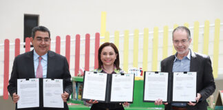El gobernador Sergio Salomón; la presidenta honoraria del Patronato, Gaby Bonilla, y directivos de la empresa firmaron un contrato de donación de 250...