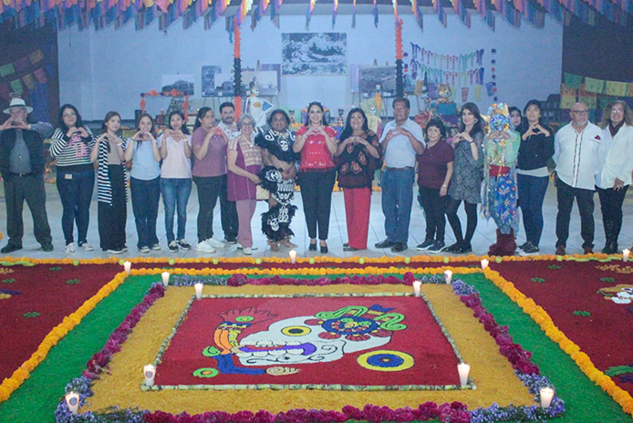 Durante el recorrido, la presidenta municipal visitó la ofrenda realizada con cartonería instalada en el Museo Casa del Caballero Águila, elaborada por estudiantes del Centro Cultural Iyolosiwa, con representaciones de animales mexicanos y seres mitológicos.