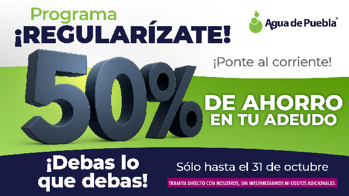 Pensando también en las familias que enfrentan adeudos, Agua de Puebla mantiene su “Programa Especial de Regularización del Día de Muertos”, que ofrece 50% de descuento sobre el total de la deuda de sus servicios de agua potable, drenaje y saneamiento, deban lo que deban. Es una oportunidad única para ponerse al corriente.